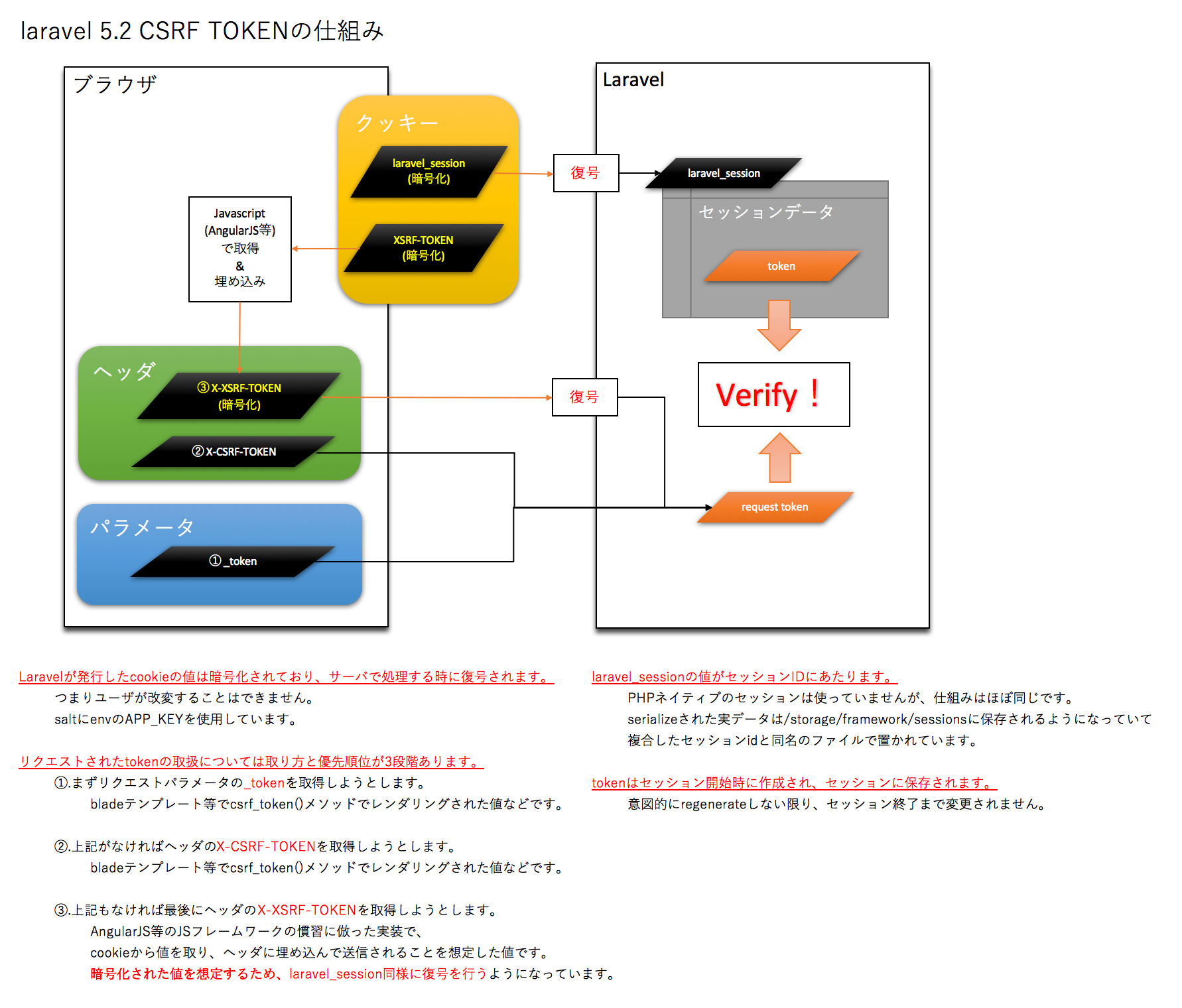 ・cookieに保存されるセッションid(laravel_session)とトークン(XSRF-TOKEN)はcookie名が違う。